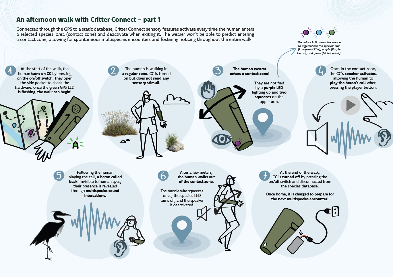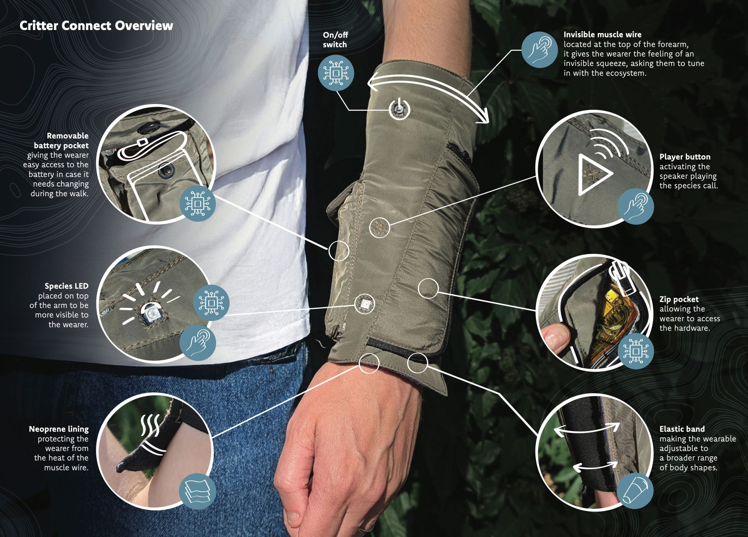 Critter Connect is a wearable device that fosters the emergence of multispecies relationships anchored in specific ecosystems through geolocation and sensory stimuli. Drawing on posthuman theories and More-than-Human geography, Critter Connect reconfigures the relationship between humans and other beings by facilitating direct, place-specific, and sensory-rich interactions.